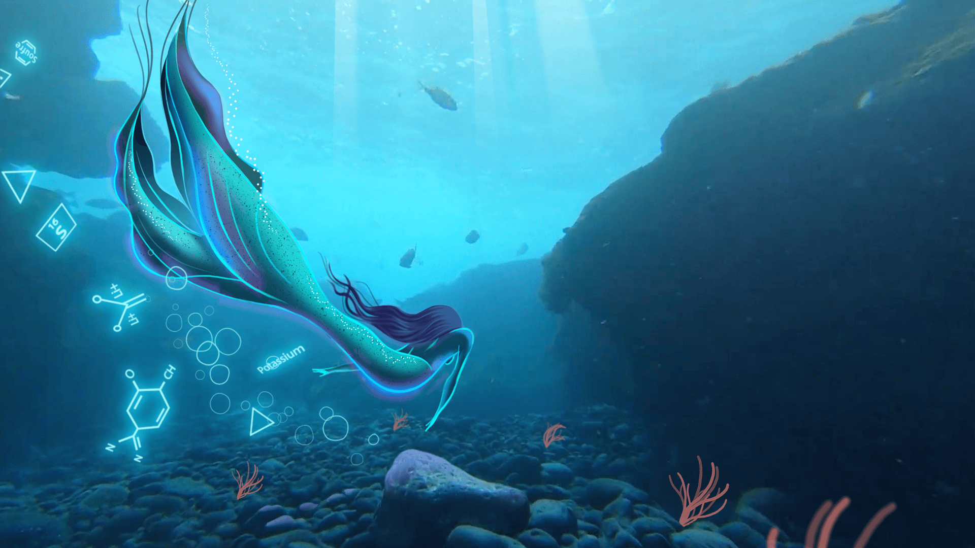 Inspired by mythology and sirens, our heroine represents the magical properties of sea water minerals found in the hydrating mist 'Aqua Rêves Tu?'. It was vital to capture the dynamics of the ocean underworld, such as the fluidity of the siren's hair; and the low camera angles allowed us to play with silhouettes, adding to the mystery of the scene.